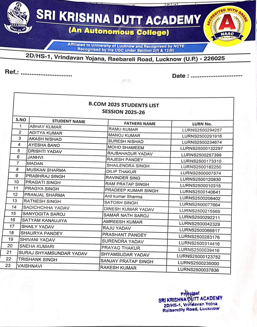 Admitted B.com students list (2025-26)