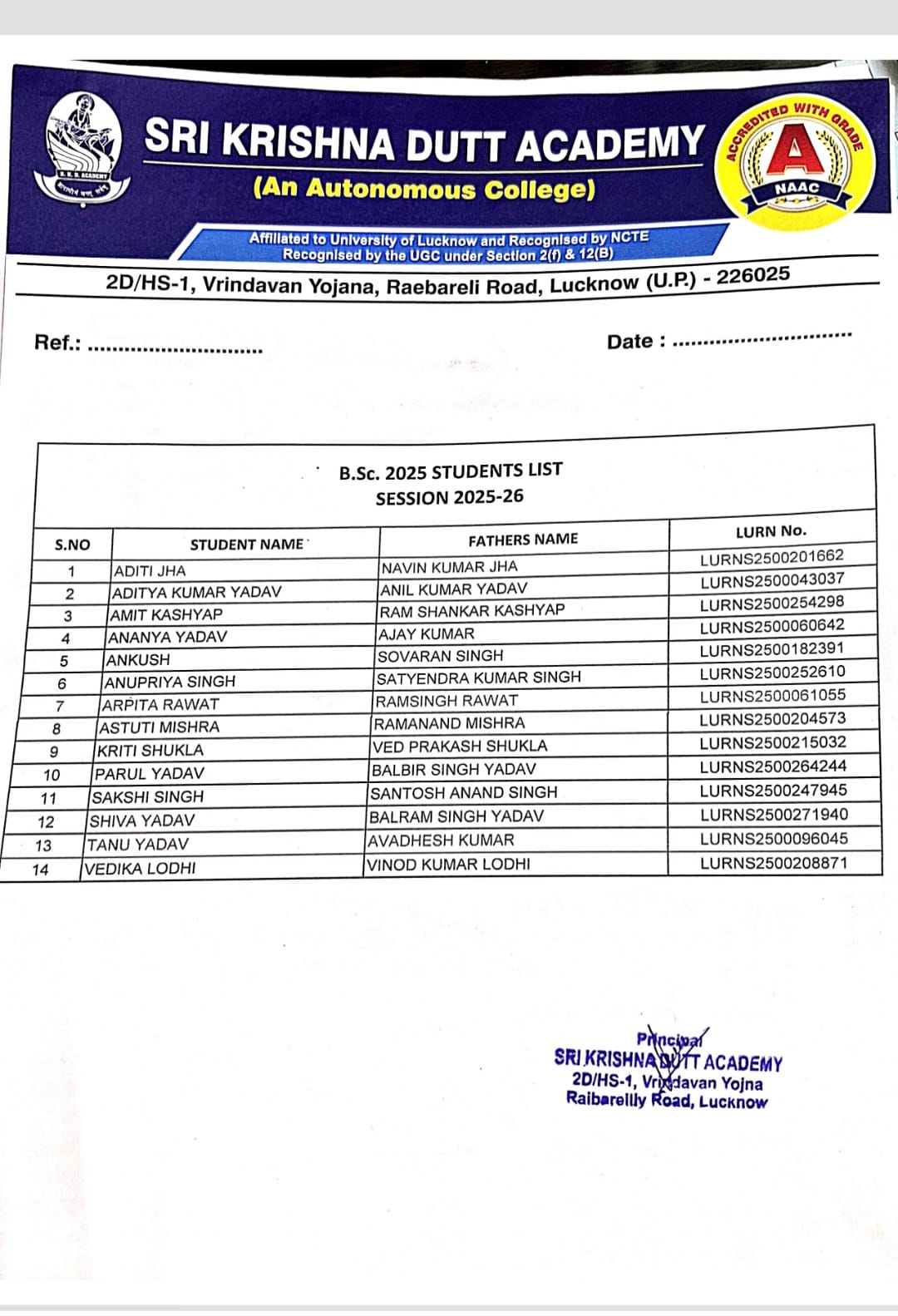Admitted B.sc students list (2025-26).